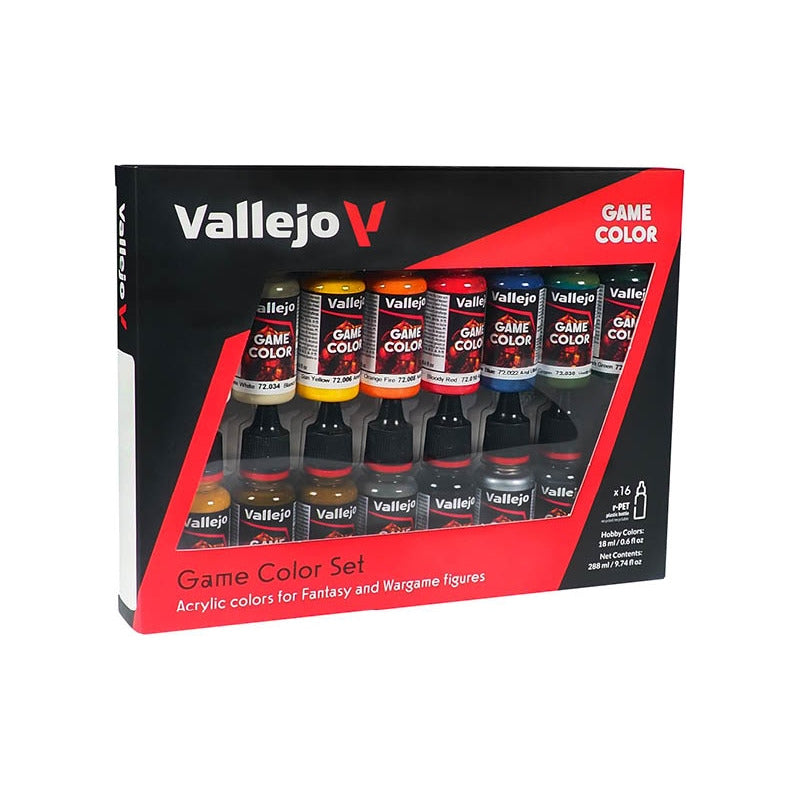 El set de introducción es uno de los surtidos de colores Game Color más populares de nuestra marca. Contiene una selección de 16 colores, 4 de ellos metalizados, especialmente diseñados para iniciarte en el apasionante mundo de la pintura de miniaturas. Contenido: 16 x 18 ml/0.6 fl oz Game Color 72.001 Blanco Calavera 72.034 Blanco Hueso 72.006 Amarillo Soleado 72.008 Naranja Fuego 72.010 Rojo Sanguina 72.022 Azul Ultramar 72.030 Verde Goblin 72.028 Verde Oscuro 72.036 Marón Bronceado 72.040 Marrón Cuero 72.043 Marrón Bichos 72.049 Gris Muralla 72.051 Negro 72.052 Plata 72.054 Gris Metalizado Oscuro 72.055 Dorado Pulido