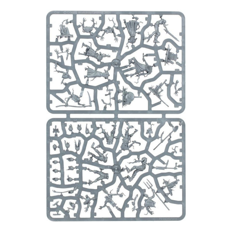 Los Deadwalker Zombies son creados a partir de cadáveres frescos; reciben la fuerza mediante el poder de necromancia oscura y son enviados al campo de batalla en una horda de paso tambaleante. Sin mente, y regidos únicamente por un instinto colectivo, las migraciones zombis se han convertido en una plaga sempiterna tras el necroseísmo A pesar de que de manera individual son lentos, torpes y frágiles, una manada de Deadwalker Zombies del tamaño adecuado puede suponer una amenaza incluso para los soldados enemigos más habilidosos, simplemente por su superioridad numérica. Su hambre mononeuronal les da un componente de velocidad sorprendente cuando la presa se acerca demasiado, y cualquier desafortunado que caiga en sus garras acabará por unirse a los rangos Soulblight antes de que acabe la batalla. En el interior de esta caja encontrarás 94 componentes de plástico, con los que puedes montar 20 Deadwalker Zombies. Estas miniaturas vienen acompañadas de 20 peanas Citadel redondas de 25 mm.