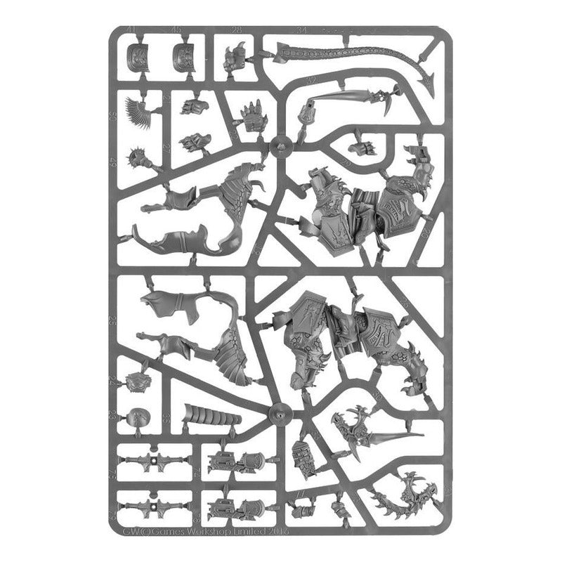 Este kit de plástico multicomponente contiene lo necesario para montar dos Dracothian Guard Fulminators armados con espadón azotatormentas y escudo sigmarite, montados ambos en sendos feroces Dracoth. Este kit también te permite montar cualquiera de las siguientes variantes de la Draconthian Guard: - Tempestors, armados con ballestas tempestad, espada de guerra y escudos de sigmarite; - Concussors, armados con martillos relámpago y escudos de sigmarite; - Desolators, armados con hachas de trueno y escudos de sigmarite. Este kit de 80 componentes incluye dos peanas Citadel ovaladas de 90x52 mm.