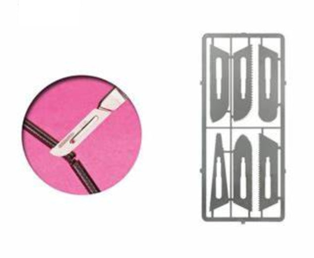 El set incluye 6 finas hojas de sierra de precisión (grosor 0.24 mm). Excelente para cortes de trazo irregular sobre plástico, madera y fotograbado. Las cuchillas pueden adaptarse a todos los mangos tipo cúter-bisturí